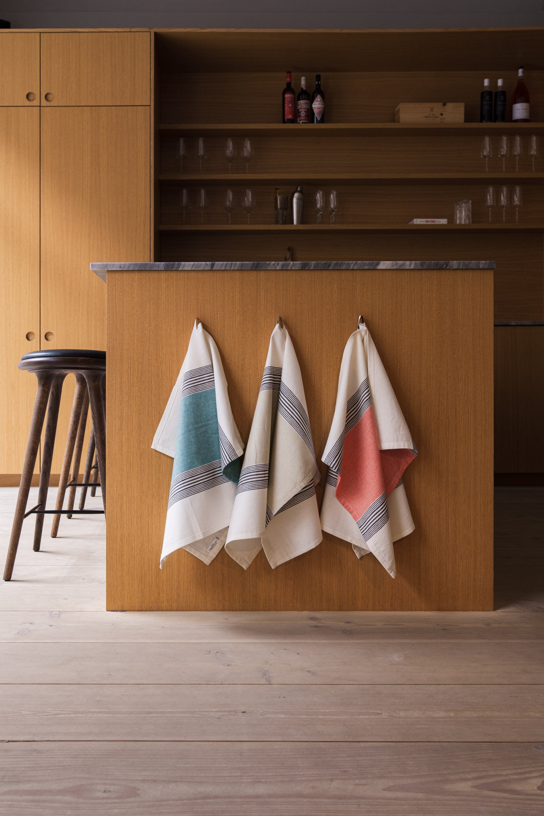 The dish towels are available in 3 color combinations: rose with black and white stripes, olive with black and white stripes, and teal blue with black and white stripes. The dish towels are 50×70 cm and have strips in both sides. The dish towels are light, have a fantastic absorbency and dry quickly.