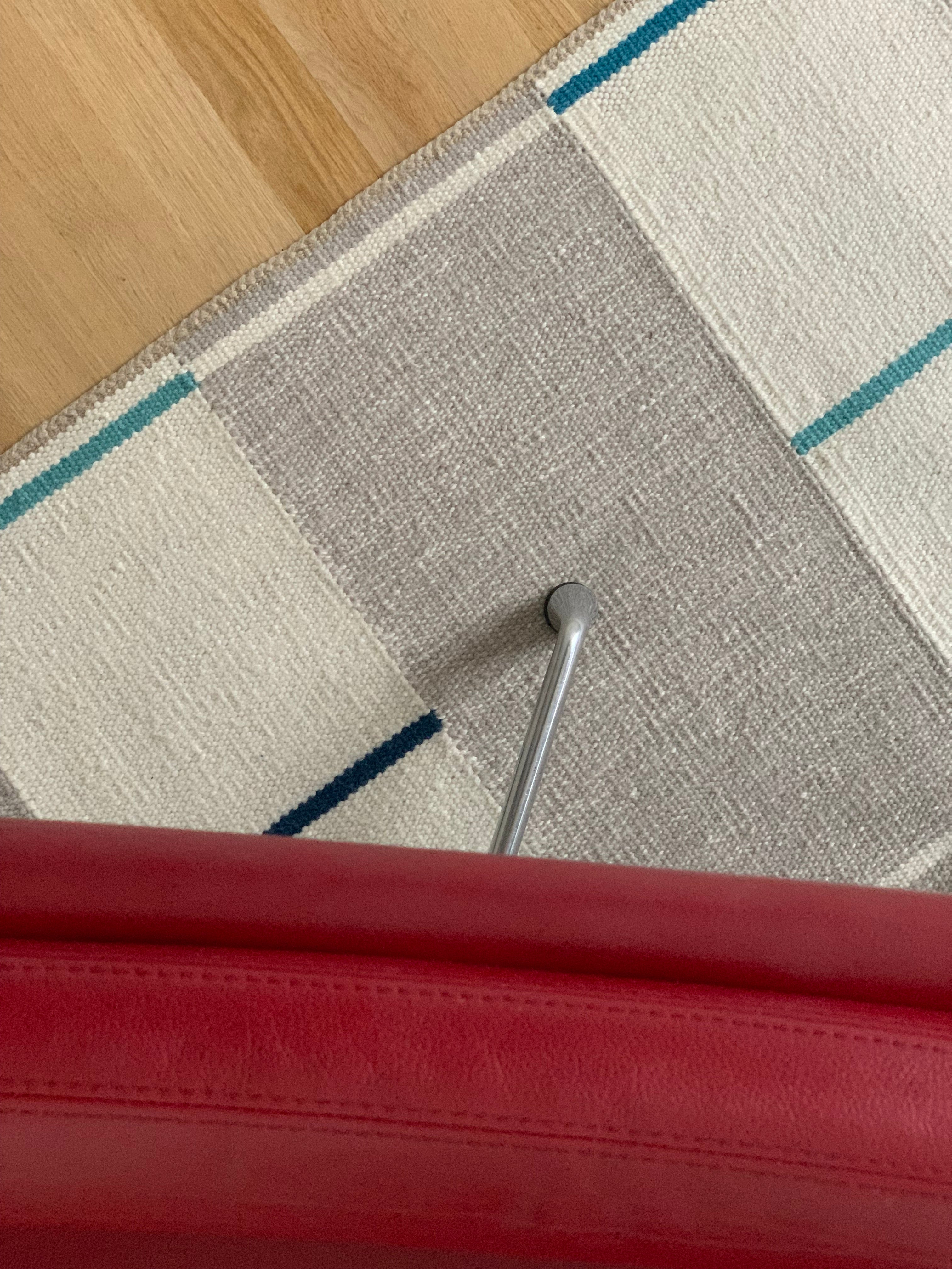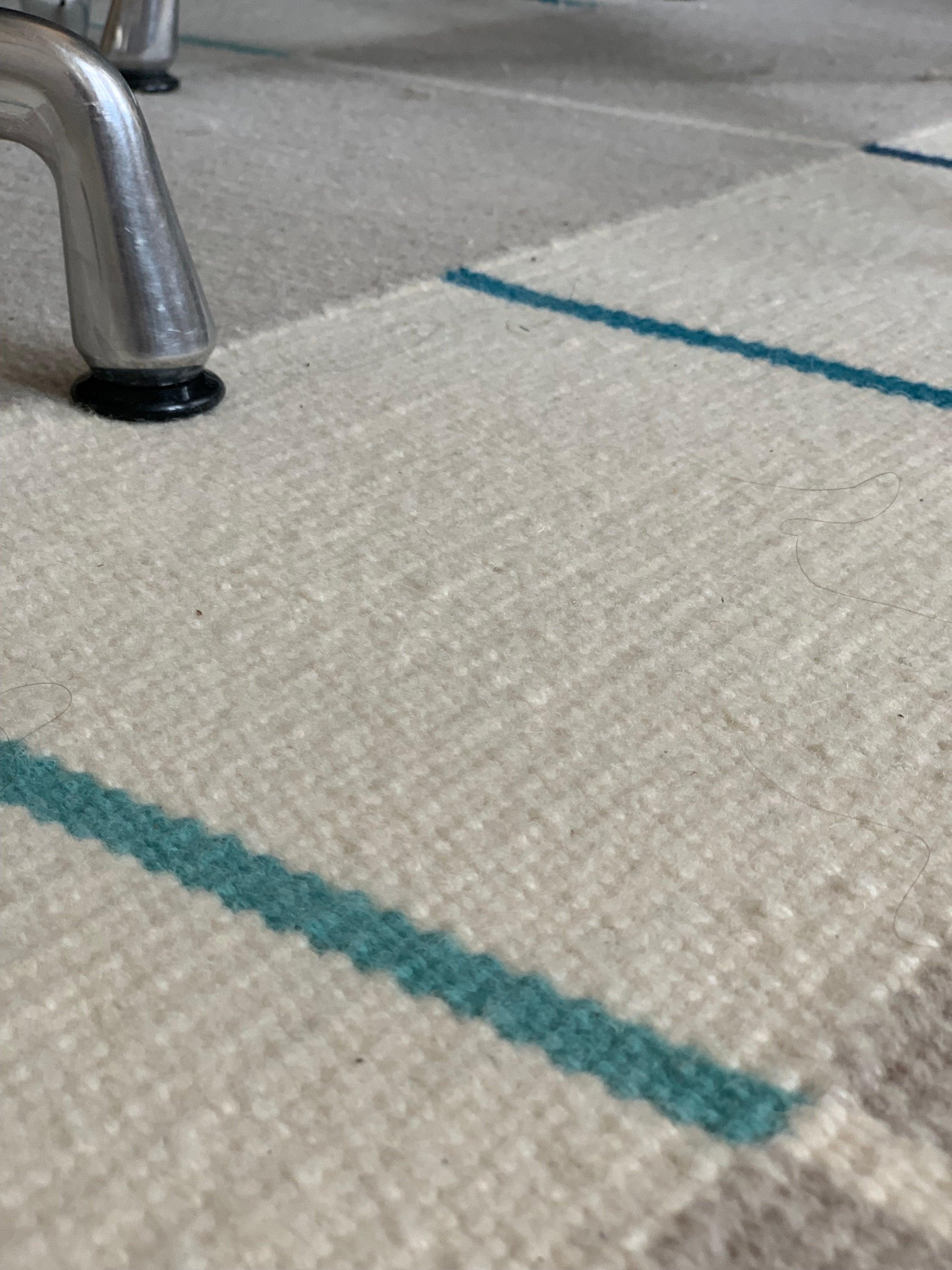 As always, she drew inspiration from the room where her rugs would be placed. The rug nearly covered the entire meeting room and incorporated blue details to match the walls, which were painted in one of the blue shades.