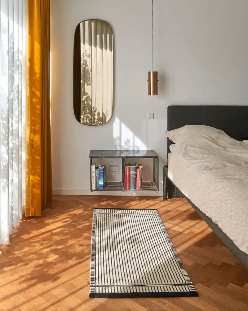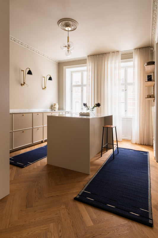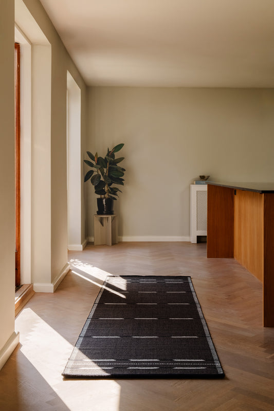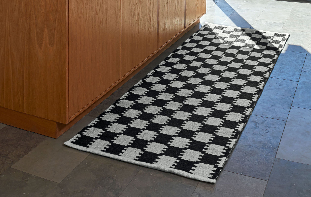 Undgå langhårede tæpper, der er svære at støvsuge og krummer og snavs nemt kan komme i klemme mellem fibrene. Undgå lyse, ensfarvede tæpper, hvor pletter er mere synlige. NORDICMODERN anbefaler et vendbart tæppe i naturmaterialer til køkkenområdet.