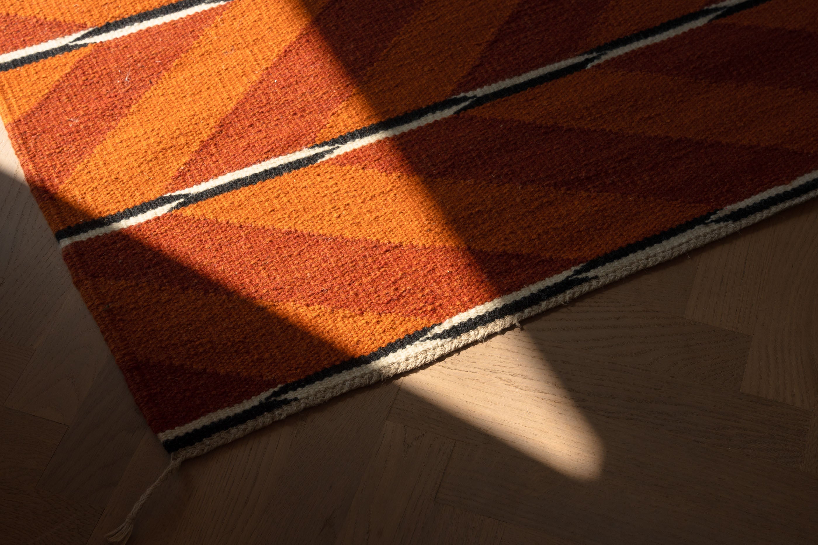 Tæppet er vendbart og tåler selv meget hårdt brug. 100% newzealandsk uld har et højt indhold af lanolin, hvilket gør tæppet naturligt smudsafvisende. Fås i farvekombinationen orange/rød med detaljer i sort og hvid. Leveres i 4 standard størrelser.